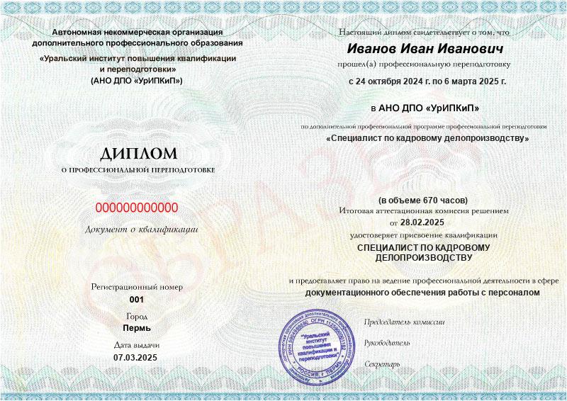 Да, дипломы и удостоверения оформляются в соответствии с действующим законодательством РФ. Документы печатаются на специальных бланках, заверяются печатью АНО ДПО «УрИПКиП».