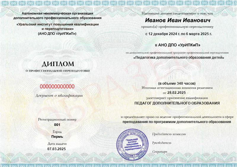 Да, дипломы и удостоверения оформляются в соответствии с действующим законодательством РФ. Документы печатаются на специальных бланках, заверяются печатью АНО ДПО «УрИПКиП».